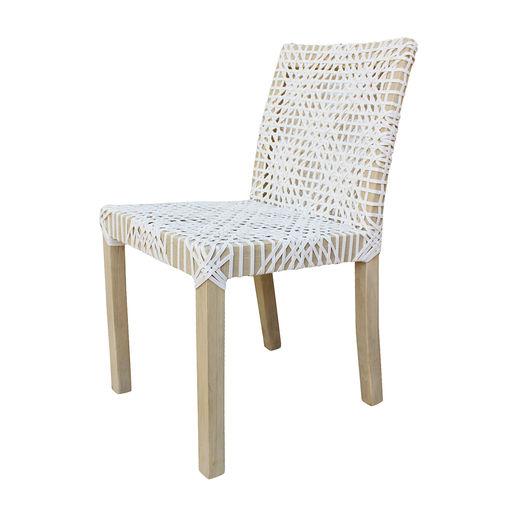 Our Lulu Dining Chair is crafted from plantation teak wood wood, the chair's frame showcases the natural beauty of the wood's grain while maintaining a sleek and sophisticated appearance. The seat and back are covered in a creative weave of white cow leather, making it a unique stylish piece of furniture.