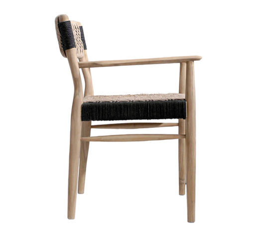 Our Rhona Dining Chair is crafted from plantation teak wood wood, the chair's frame showcases the natural beauty of the wood's grain while maintaining a sleek and sophisticated appearance with black and natural accents. The seat and back are covered in loom with creative pattern webbing, making it a unique stylish piece of furniture.