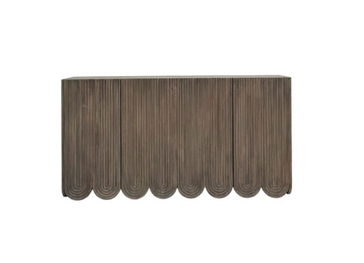 The Adelle sideboard features gorgeously fluted scalloped doors in a beautiful satin smoke finish. Made from engineered wood and sustainable Bayur wood.