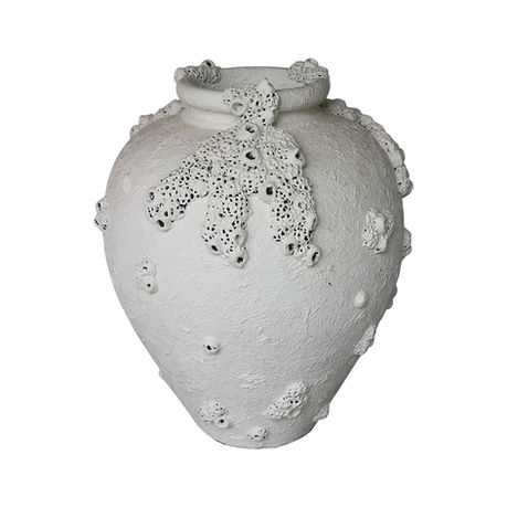 The Barnaca Small Vase is hand-thrown from terracotta and finished with a rough white coating that emphasizes its organic form and surface detail. Each piece is individually shaped and hand-carved, creating raised, barnacle-inspired textures that vary subtly from vase to vase. Because it is handmade, no two pieces are exactly alike, with natural variations in carving, texture, and color contributing to the character of each vase. Designed as a decorative object, this size brings depth and visual interest to a space and is ideal for shelves, smaller consoles, or layered tabletop styling where surface detail can be appreciated up close.