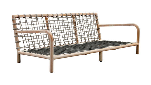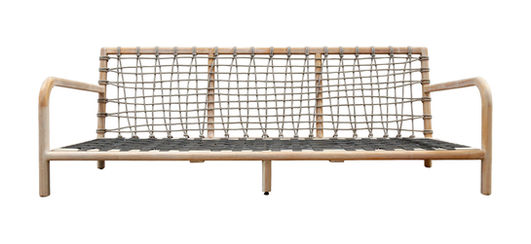 The Laguna Outdoor Sofa pairs architectural presence with gentle, coastal texture. Its reclaimed-finish plantation teak frame forms a sculptural foundation, while taupe 8mm rope is handwoven into a VH-cross pattern along the back for dimensional detailing. The seat is reinforced with 4cm wide black outdoor straps, offering supportive resilience beneath plush Hampton-fabric cushions. With deep foam seating, a supportive backrest, and a matching pillow, Laguna creates a serene, elevated lounging experience.