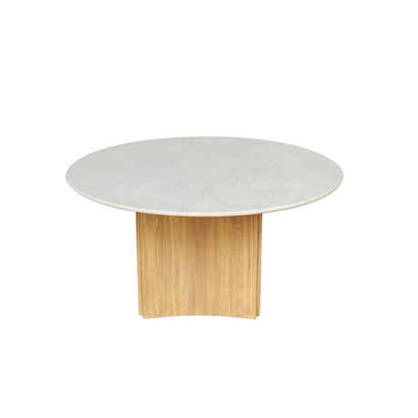Our Curve Dining Table pairs a polished sandstone top and a sculptural mindi wood base. Its circular surface brings a sense of luxury and timelessness, while the star-like wooden foundation adds warmth and flow through its gently curved panels. Blending organic texture with geometric form, it stands as both a functional table and a statement piece.