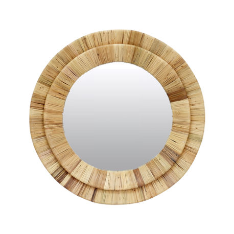 The Calista Round Mirror pairs a classic circular mirror with a richly textured rattan frame composed of layered, hand-arranged elements. The dimensional design adds depth and warmth while maintaining a clean, balanced silhouette. Versatile and timeless, this mirror works beautifully as a standalone accent or as part of a curated gallery wall, complementing coastal, organic modern, and transitional interiors.