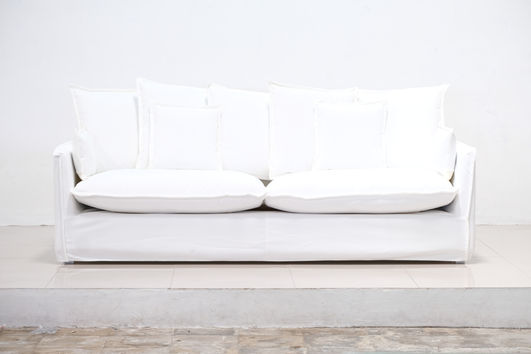 The Jason Slipcover Sofa is crafted from a powder coated aluminum frame. The slipcover is made from a white outdoor grade fabric which covers the piece's outdoor grade cushions. The white fabric and clean lines of the piece provide a sense of tranquility and luxury to any outdoor space.